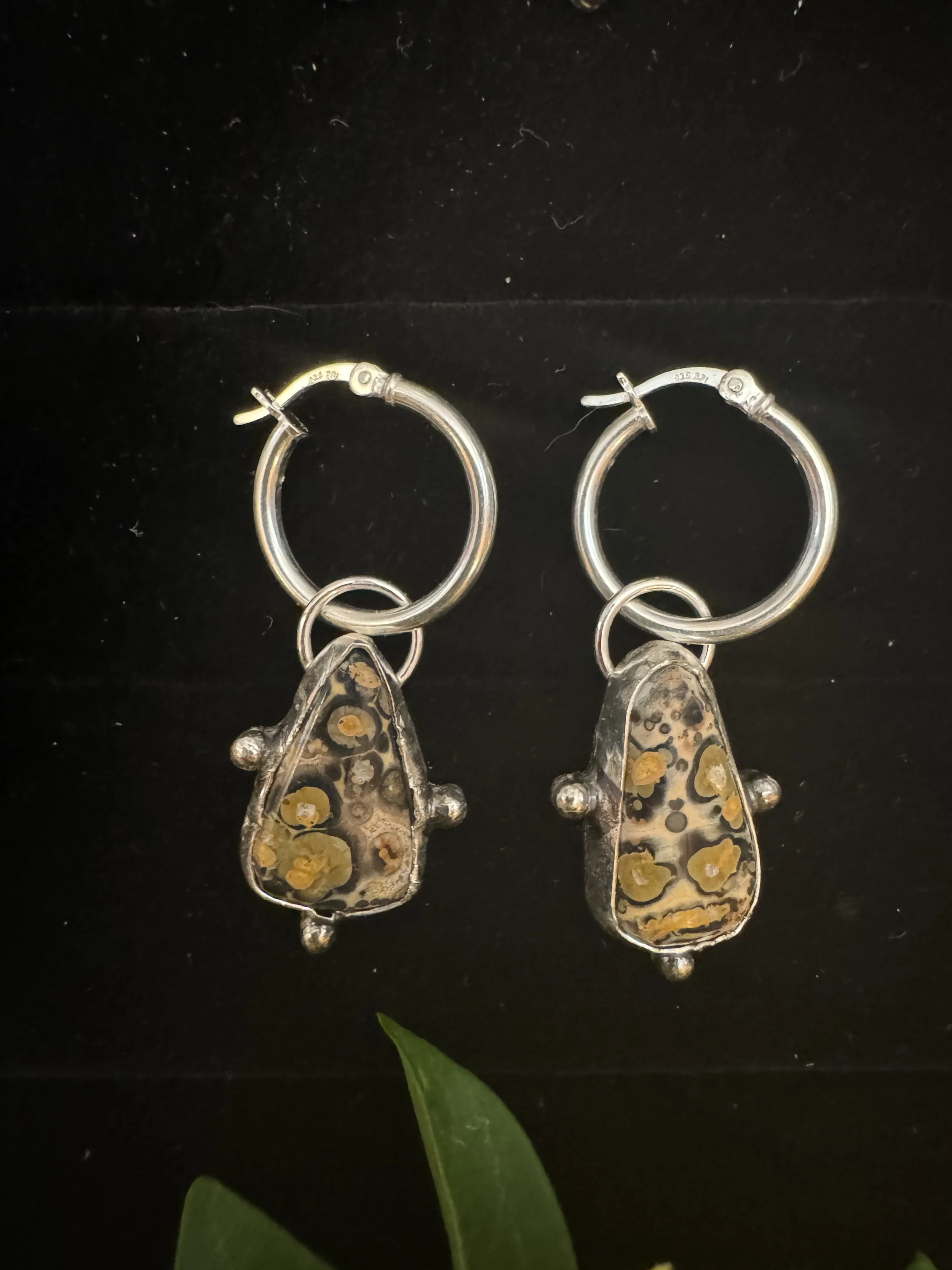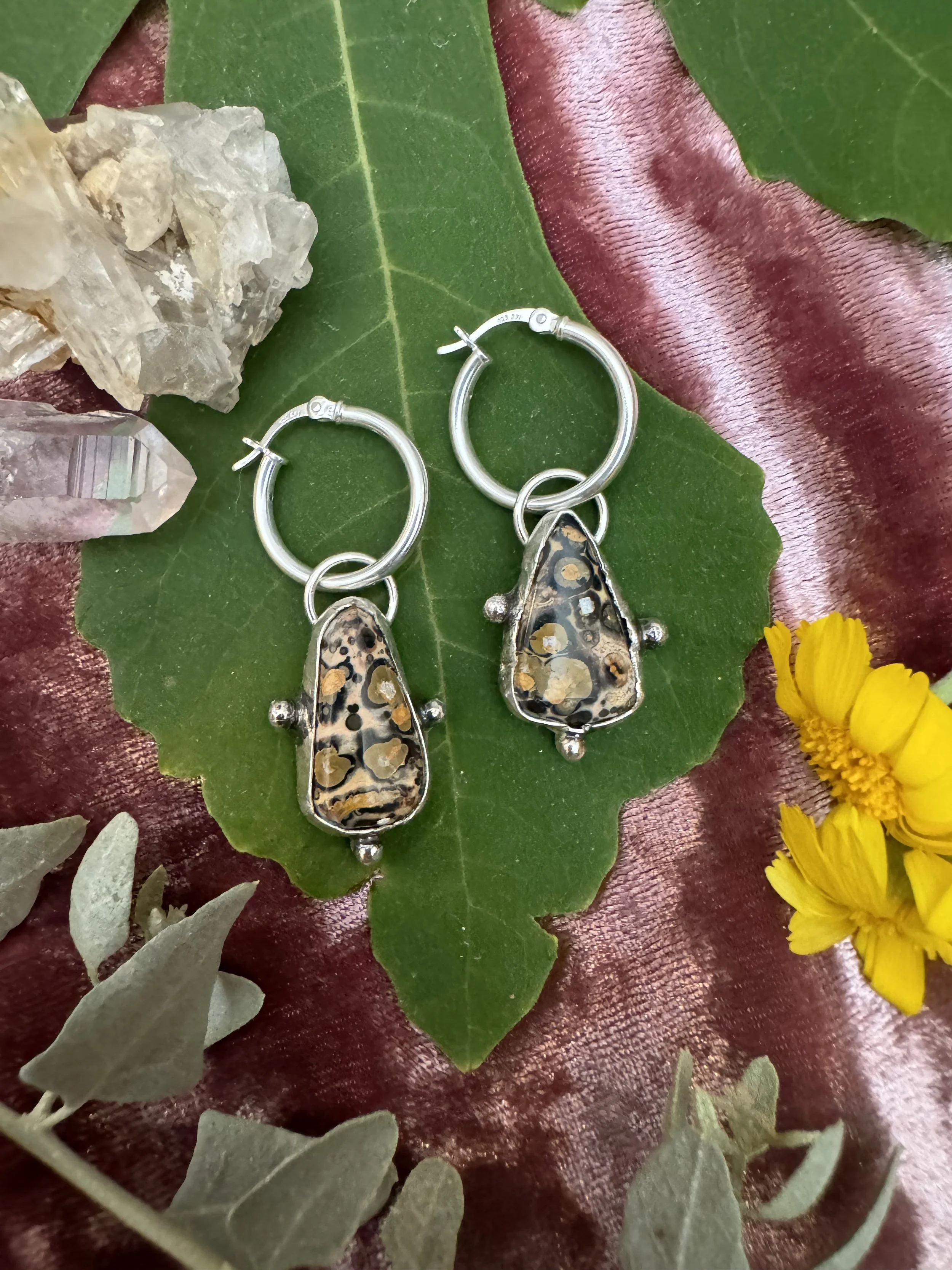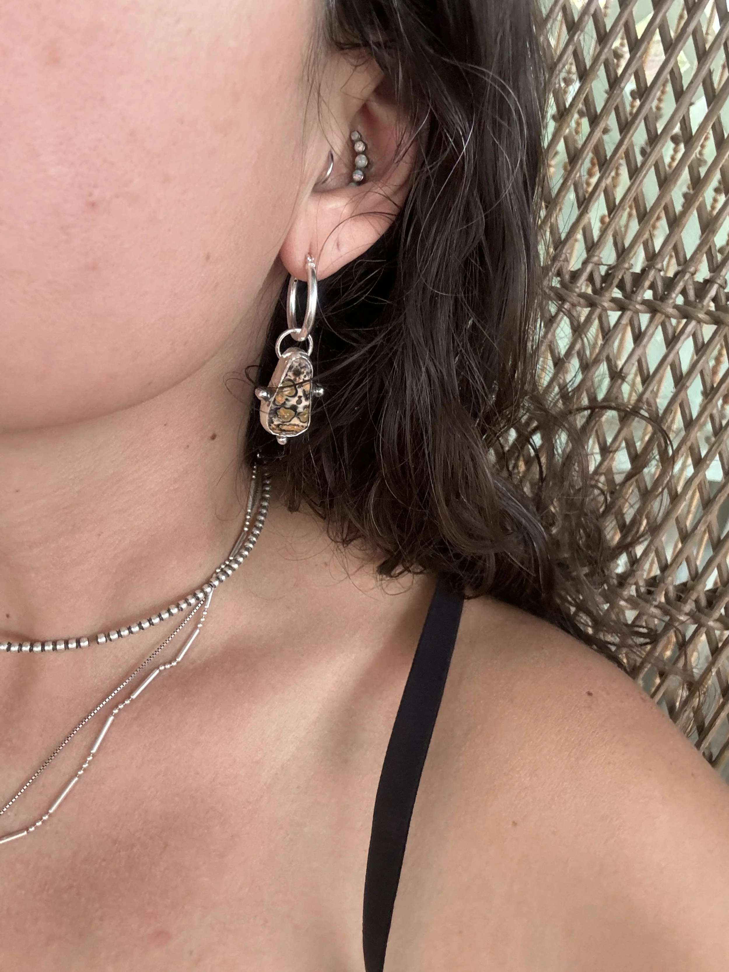 Handmade sterling silver leopard Jasper charm hoop earrings. These earrings can be worn two different ways. The gemstone charm can be removed from the hoop if you want to just wear the hoops by themselves. Super lightweight and easy to wear.
