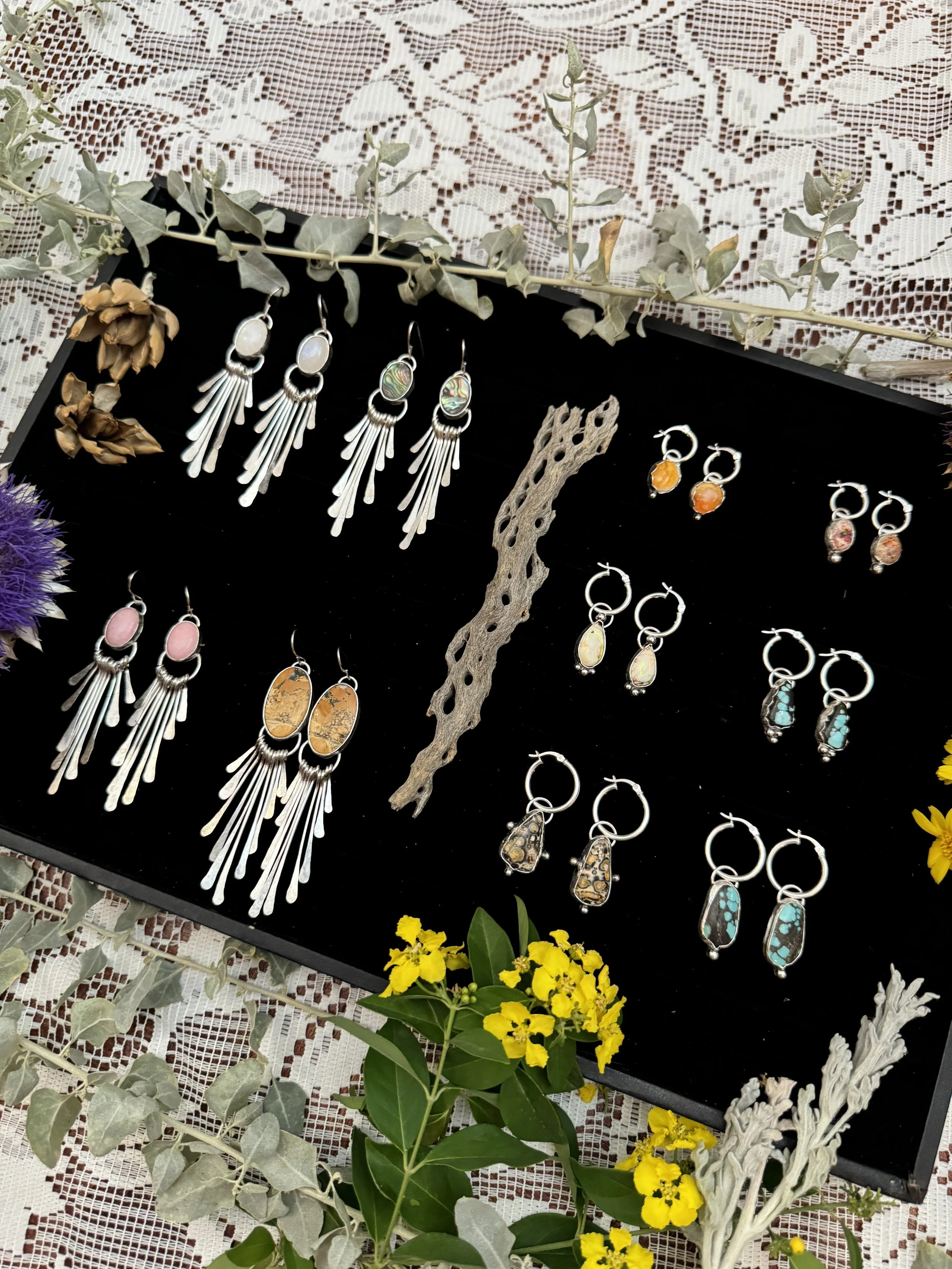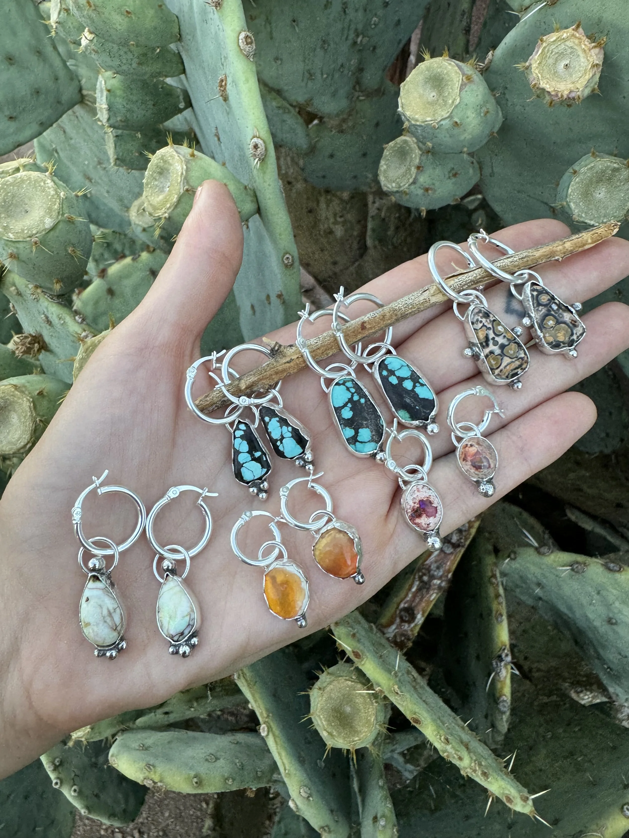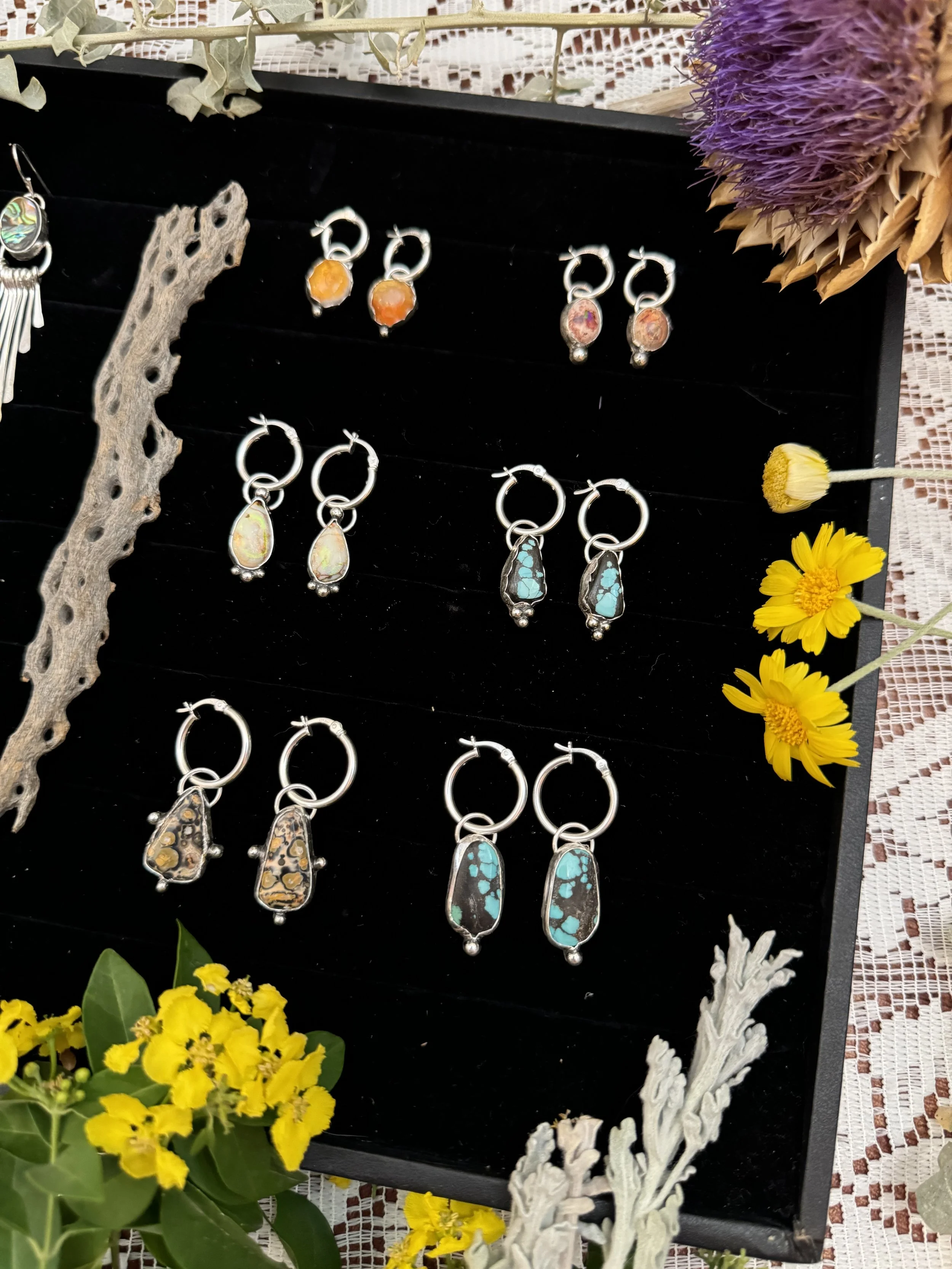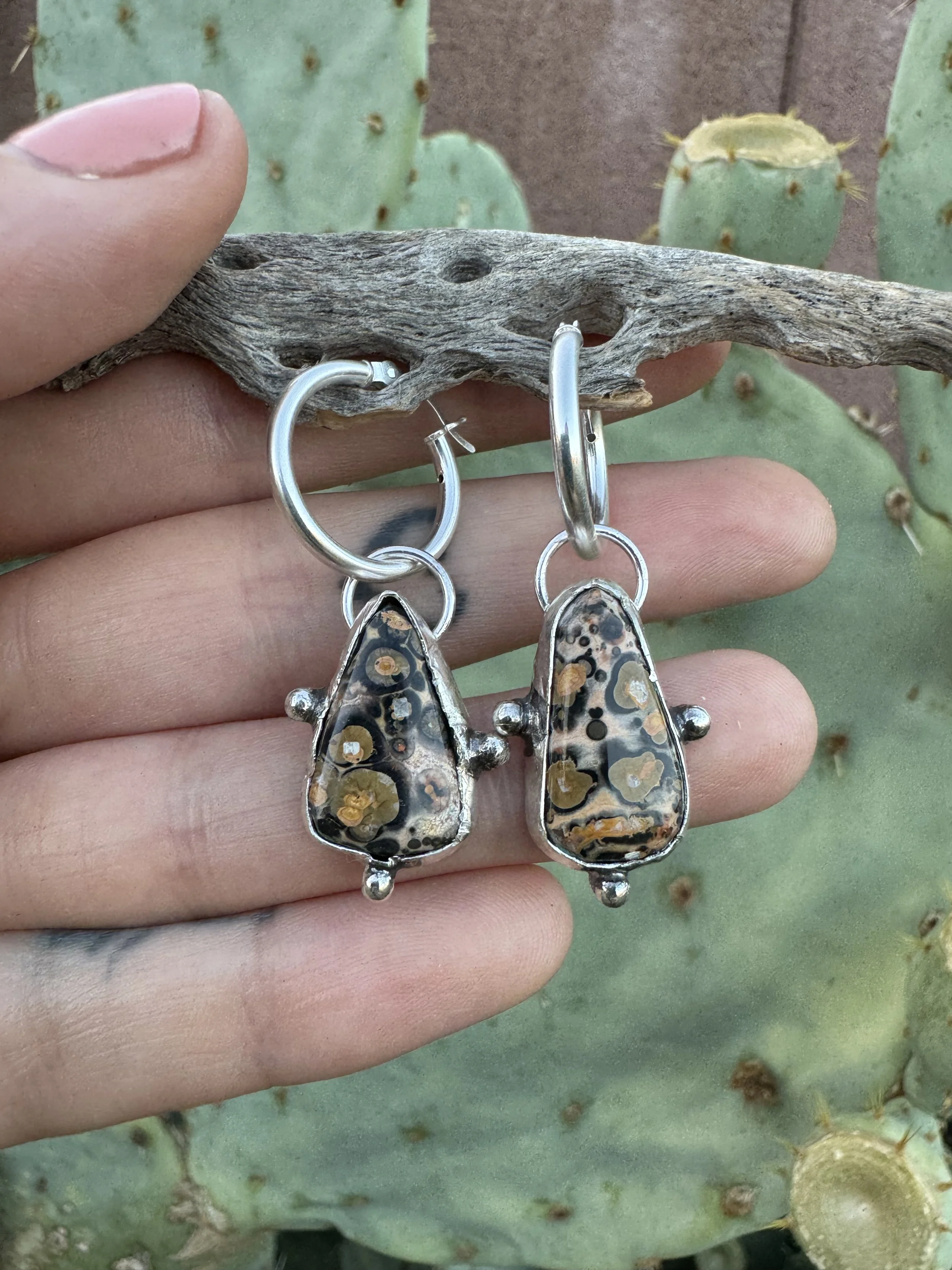Handmade sterling silver leopard Jasper charm hoop earrings. These earrings can be worn two different ways. The gemstone charm can be removed from the hoop if you want to just wear the hoops by themselves. Super lightweight and easy to wear.