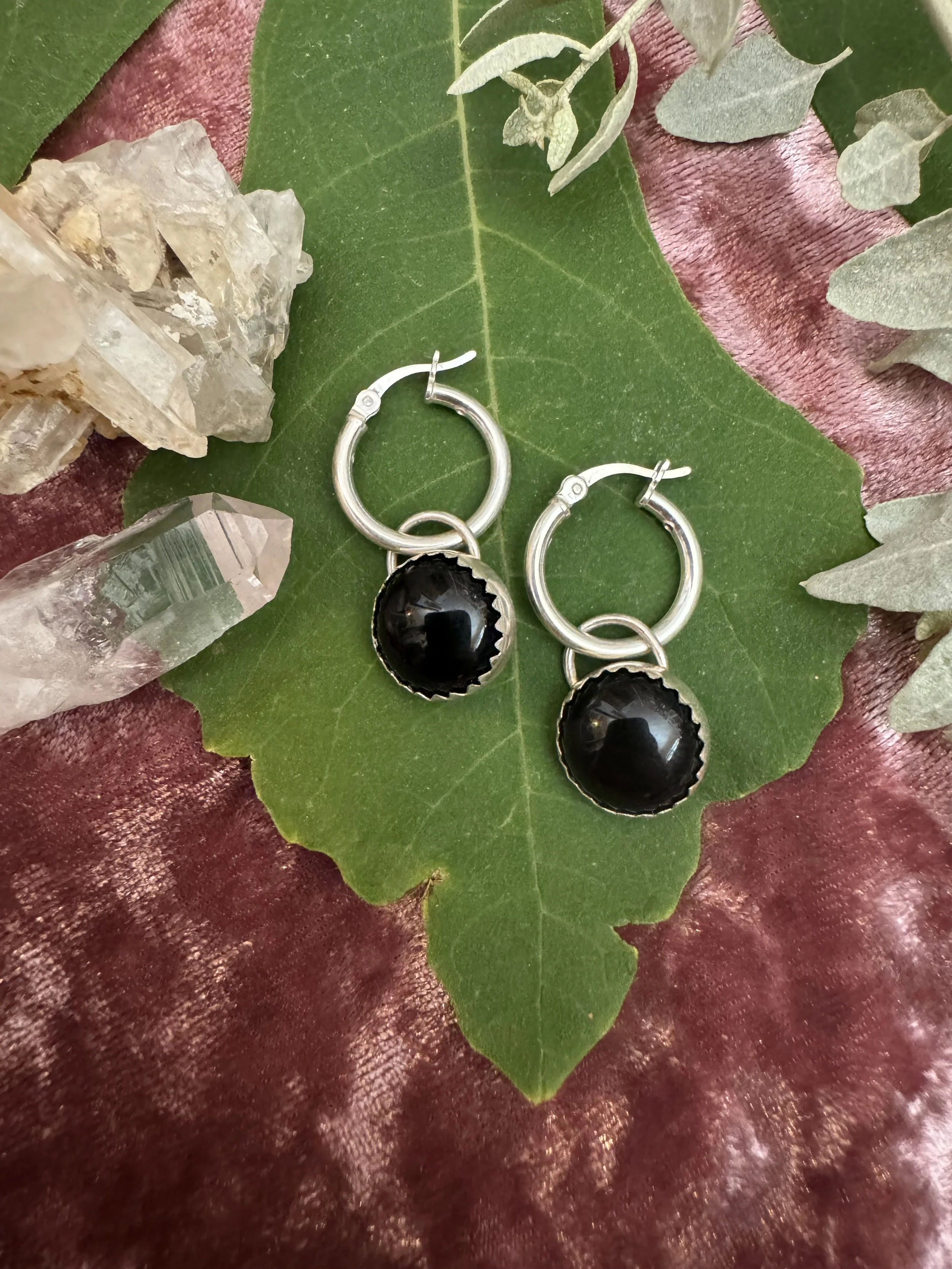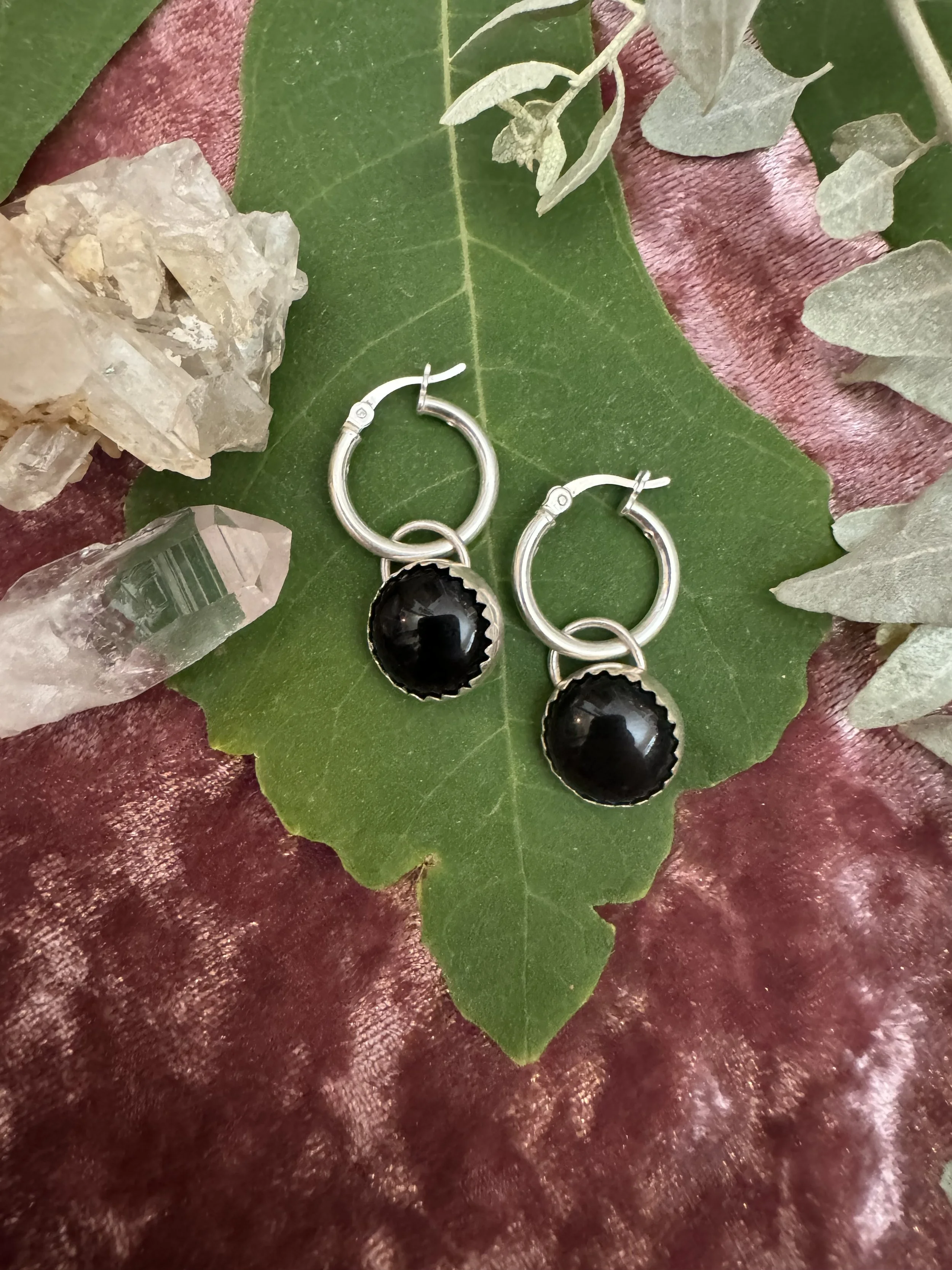 Handmade sterling silver onyx charm hoop earrings. These earrings can be worn two different ways. The gemstone charm can be removed from the hoop if you want to just wear the hoops by themselves. Super lightweight and easy to wear